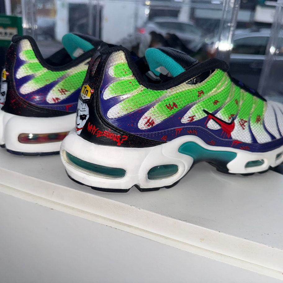 Bold, rare, and full of attitude — the Nike Joker Grape TNs turn heads with their striking purple and green colourway, inspired by the iconic “Joker” aesthetic. Built on the legendary Air Max Plus silhouette, they feature breathable mesh uppers, wavy overlays, and the signature TN cushioning for all-day comfort. With their unique grape-and-neon accents, these trainers bring a mix of street style and statement design that makes them a true collector’s piece.
